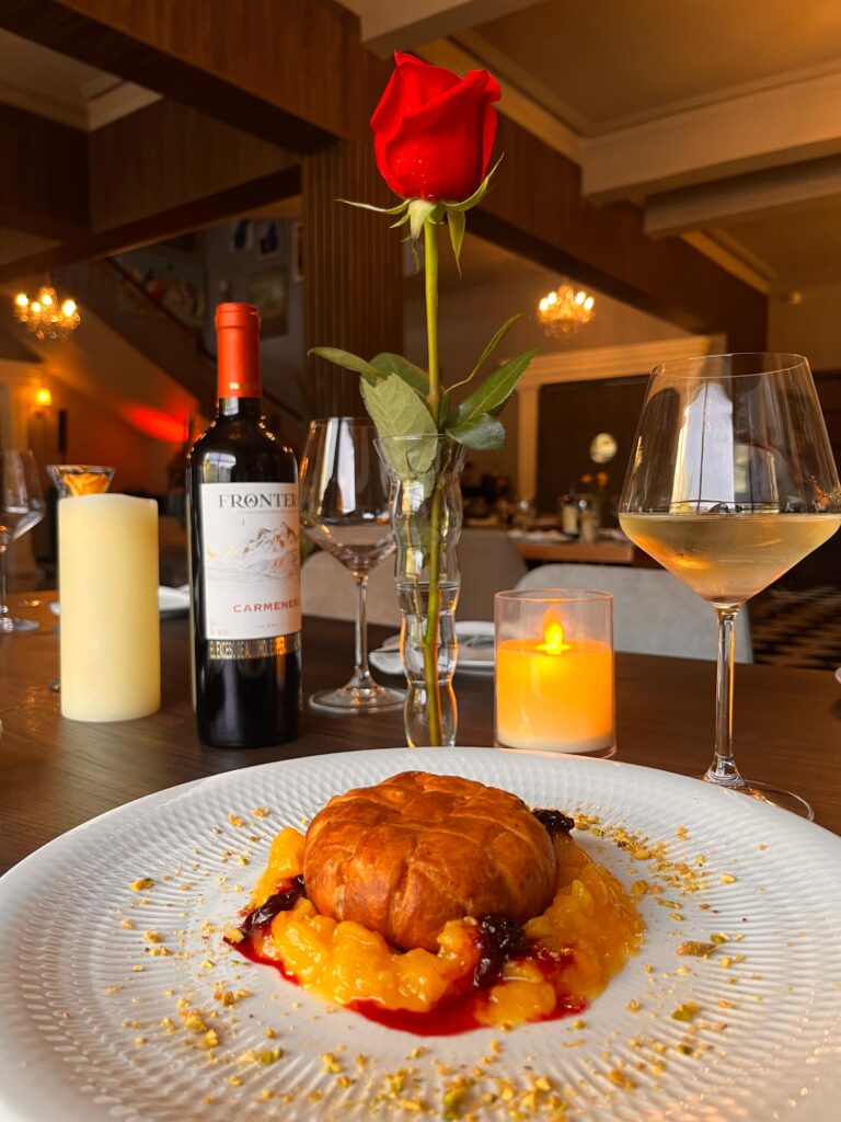 Arepita Asada, media salchicha de pavo, huevos revueltos, lonja de jamón y de queso, mantequilla y suero, café tinto, capuccino o milo, jugo de naranja.