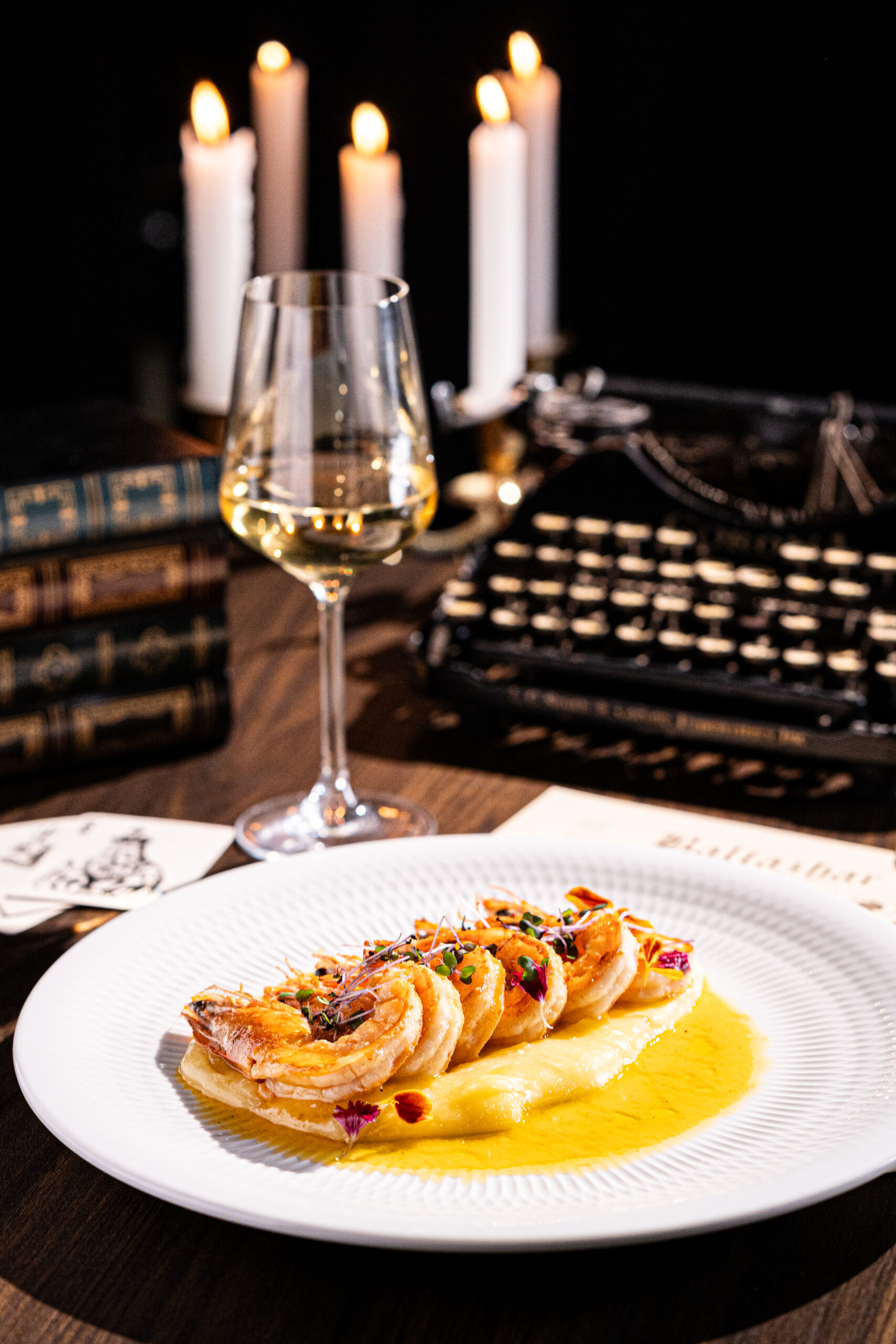 Dorados con aceite aromatizado de ajo, en cama de yuca cremosa y salsa de vino blanco