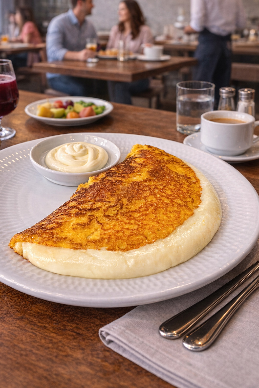 Una mezcla de maíz amarillo puesta en budare rellena de un queso de mano hecho en casa.