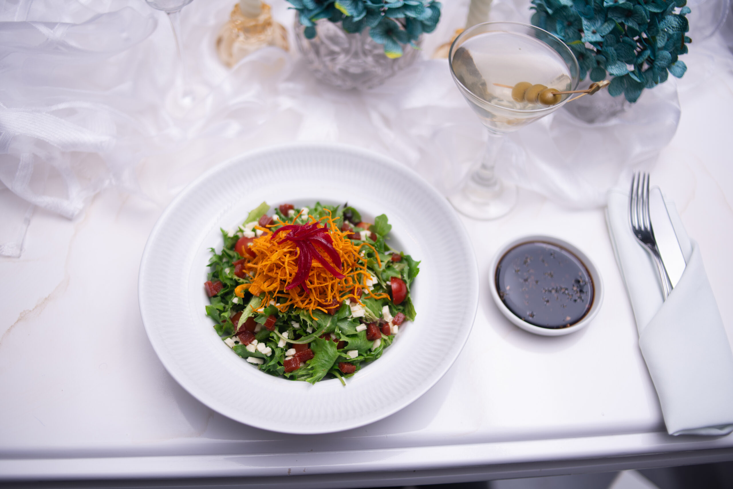 Mix de lechugas, arugula,  tomate cherry, queso feta y bocadillo; aderezo balsámico dulce, aromatizado con albahaca