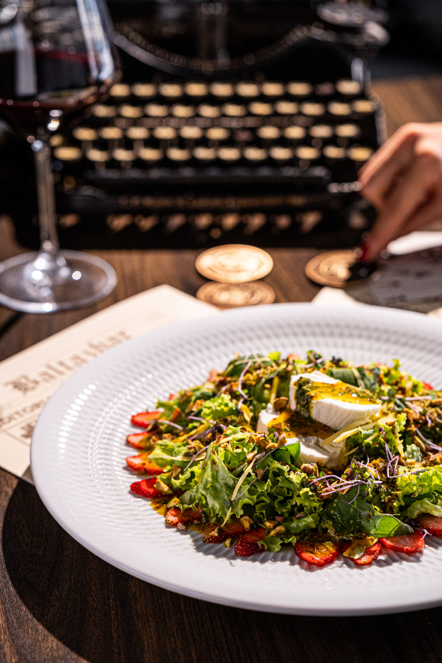 Mezcla de lechugas y arugula, frutas de temporada, queso de cabra y pistachos; aderezo de semillas de mostaza especial.