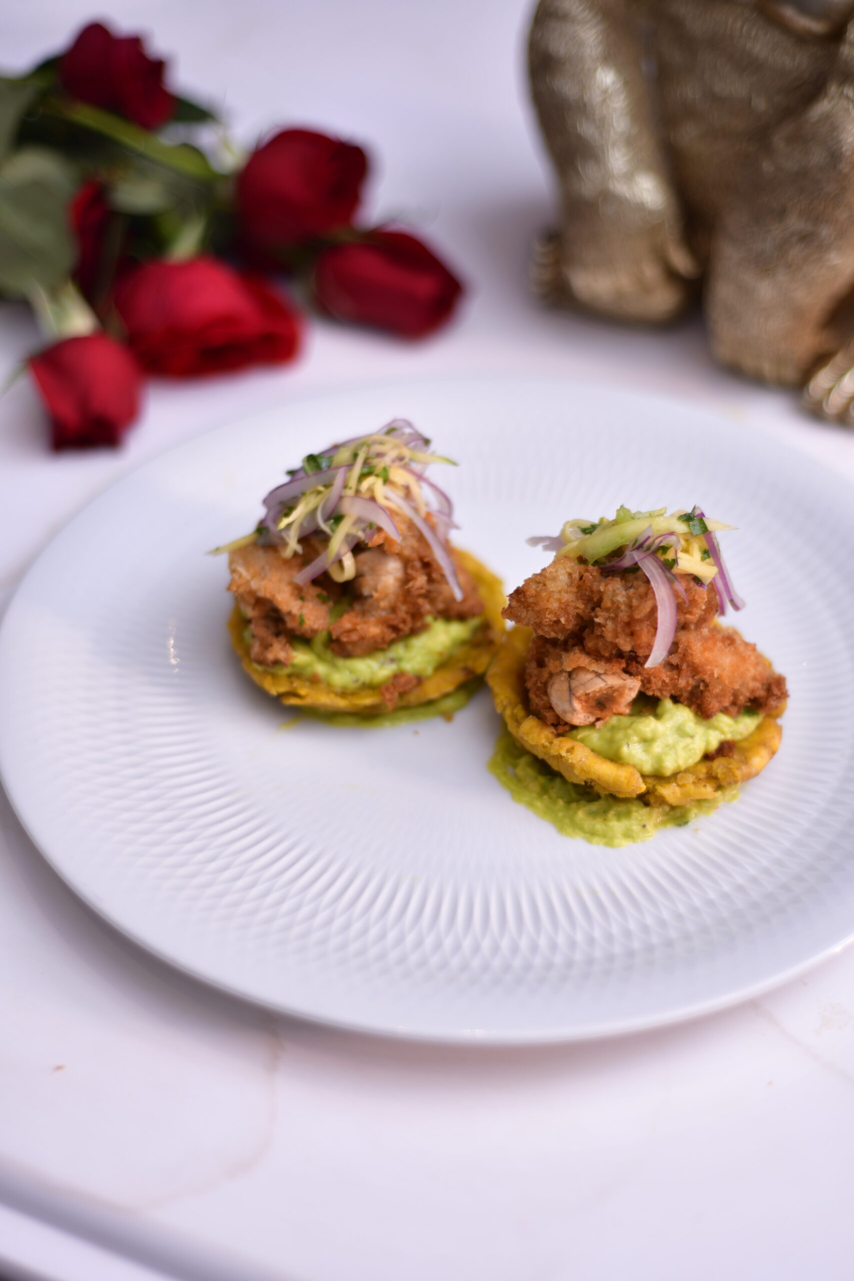 Huevas de pescado rebosadas, sobre un crujiente de plátano verde, cremoso de aguacate con criolla de mango verde.
